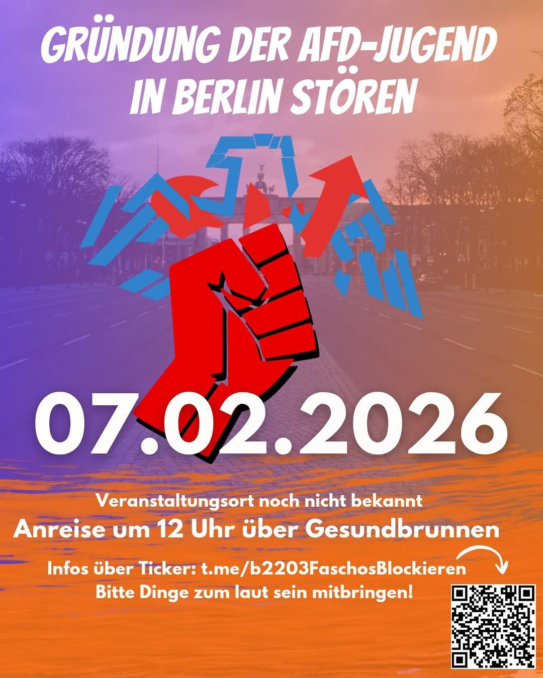 🚨📢❗Am Samstag (7.2.) will sich der Berliner Ableger der sogenannten Generation Deutschland gründen. Wir treffen uns um 12:00 Uhr am S Gesundbrunnen zur gemeinsamen Anfahrt.