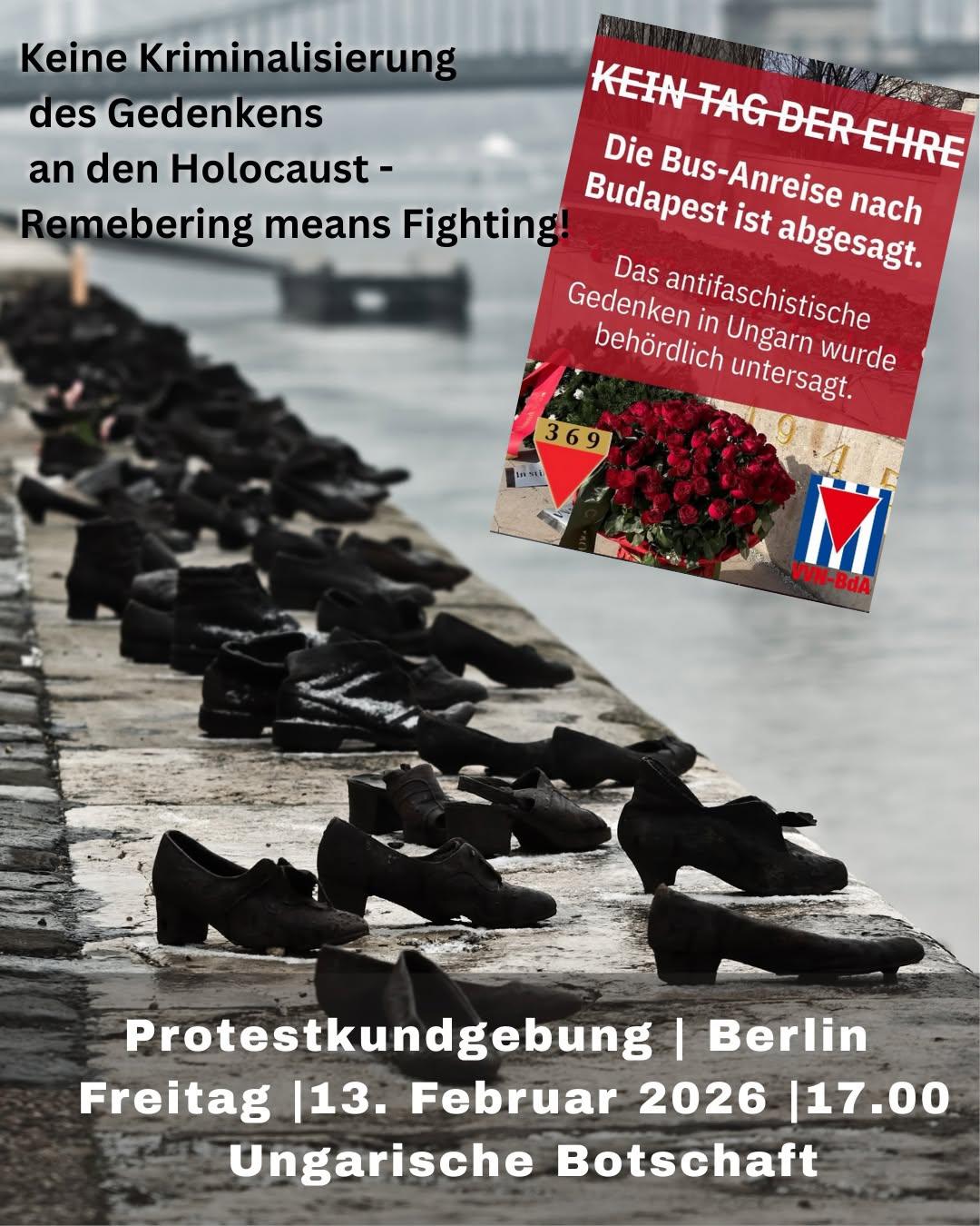 – Für Freitag, 13. Februar plant der VVN-BdA in Berlin um 17.00 eine Kundgebung vor der ungarischen Botschaft in Berlin.