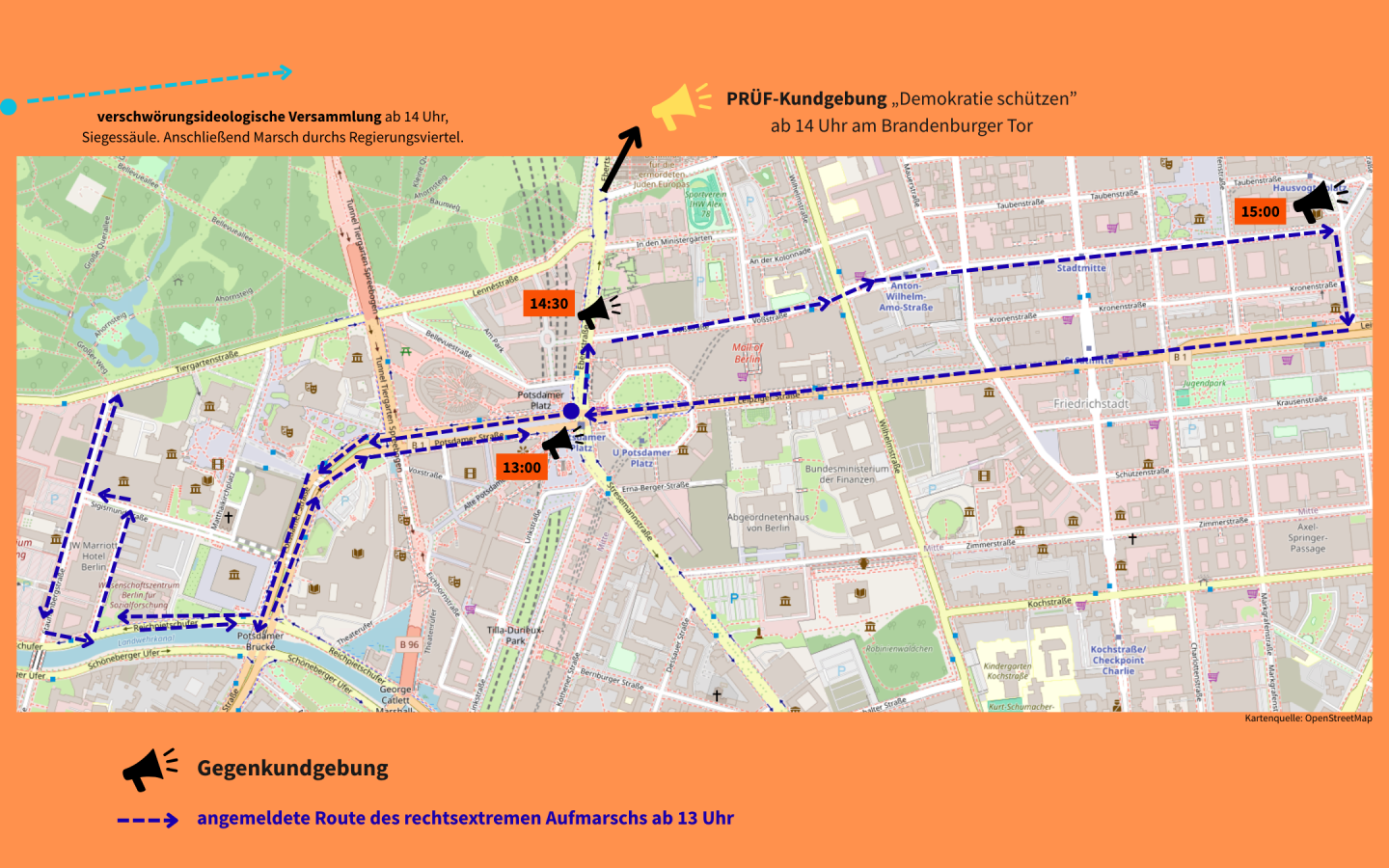 14:30 Uhr Potsdamer Platz Nord (Ebertstr./Hans-von-Bülow-Str.), „Kein Naziaufmarsch in Mitte – Gegen rechte Hetze unter dem Deckmantel der Meinungsfreiheit“