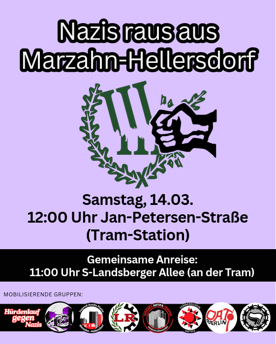Am 14.3. will „Der III. Weg“ in Berlin-Marzahn aufmarschieren. Dafür treffen sich die Neonazis ab 12 Uhr vor dem Einkaufscenter „Eastgate“ am S-Bahnhof Marzahn. Bereits 2025 organisierte die Partei einen bundesweiten Aufmarsch im Bezirk. Im letzten Jahr verhinderte die Berliner Polizei jeglichen effektiven Gegenprotest und bescherte den Nazis ein Erfolgserlebnis. Das wollen sie nun wiederholen. Ihre Strategie, mit einer kurzen Route und eine kurzfristigen Anmeldung Gegenprotest zu verhindern, dürfen wir nicht aufgehen lassen.