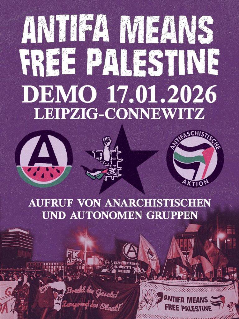 Wir unterstützen den Aufruf der antifaschistischen Gruppe „Lotta Antifascista” aus Connewitz sowie die Aufrufe von Gruppen der Palästina-Solidarität und von feministischen Gruppen (Instagram-Link) aus Leipzig zur Demo „Antifa means free Palestine” in Connewitz.