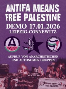 - 17.01.2026 – Demonstration „Antifa means free Palestine”, Leipzig ConnewitzGemeinsame Anreise: Berlin Hbf Gleis 14 – 9 Uhr — Wir rufen auf zur Beteiligung anarchistischer, autonomer und antifaschistischer Gruppen in der Demonstration, ab 13:00 Uhr Connewitzer Kreuz.