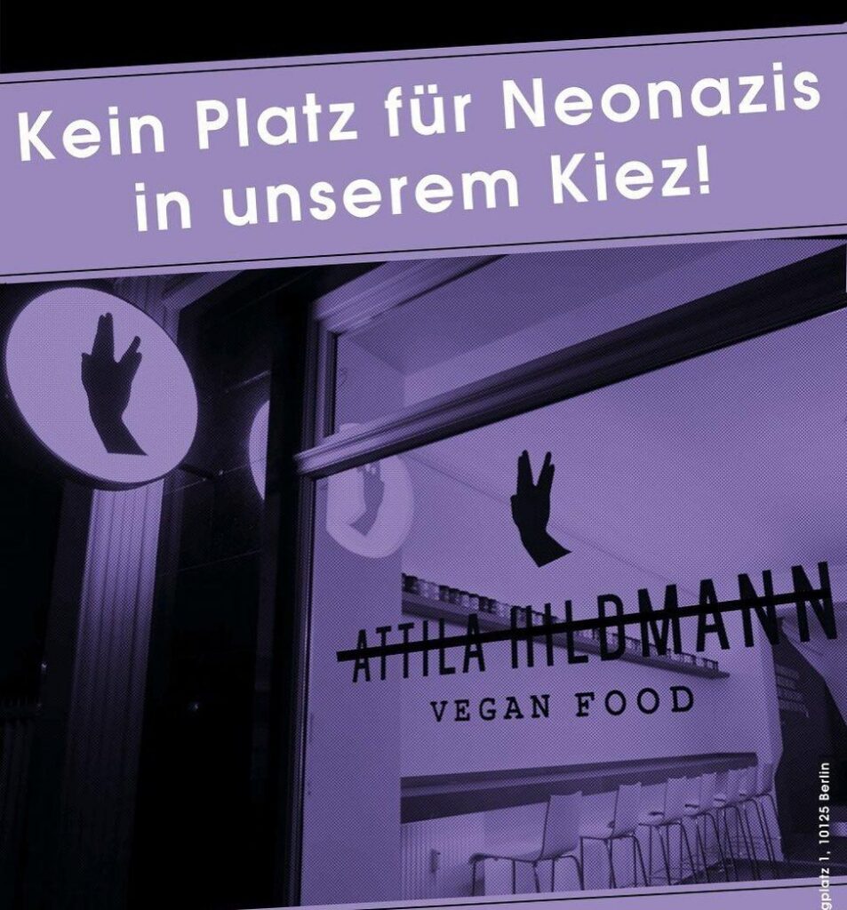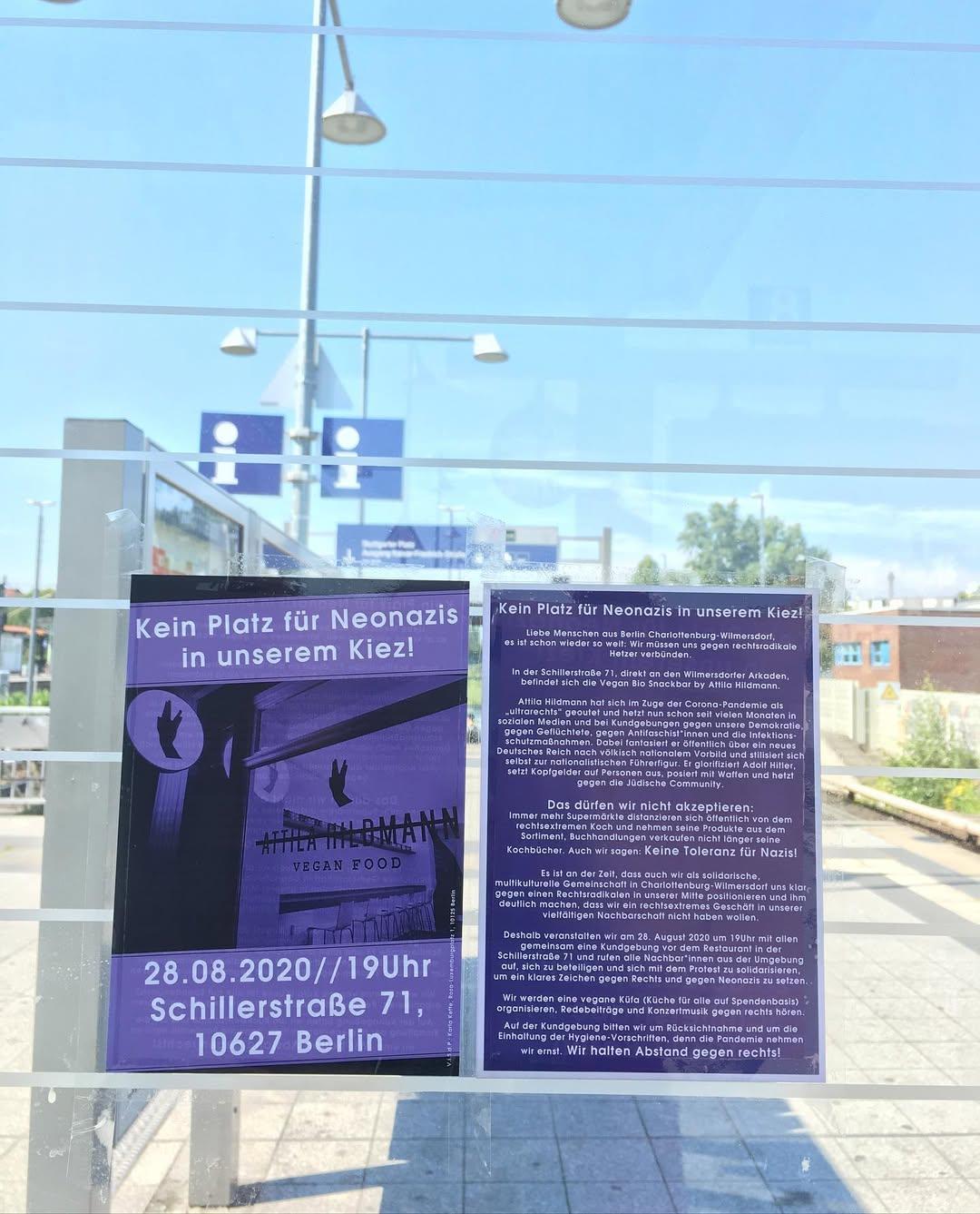 In der Schillerstraße, nahe den Wilmersdorfer Arkaden, befand sich Attila Hildmanns „vegan Bio Snackbar“. Hildmann outete sich im Zuge der Corona-Pandemie als ultrarechts und hetzte monatelang in sozialen Medien und auf Kundgebungen gegen Demokratie, Geflüchtete, Antifaschistinnen und die Infektionsschutzmaßnahmen. Dabei fantasiert er öffentlich über ein neues deutsches Reich und sieht sich selbst als nationalistische Führerfigur. Er glorifiziert Adolf Hitler, setzt Kopfgelder auf Personen aus, posiert mit Waffen und hetzt gegen Juden: Jüdinnen. Das Restaurant wurde zum Hotspot für Ultrarechte und Verschwörungsideologinnen, die die Nachbarschaft einschüchterten und belästigten. Einige Läden in der Straße hielten tagsüber ihre Türen geschlossen. Dank des politischen Engagements der Nachbarschaft konnte durch zahlreiche gemeinsame Proteste der politische Druck so hoch gehalten werden, dass der Laden schließen musste. Mittlerweile befindet sich Hildmann im Exil in der Türkei. Gegen ihn liegt ein offener Haftbefehl vor und die deutschen Behörden fahnden aufgrund mehrerer Straftaten nach ihm. (Auszug aus der Broschüre „Hinter Braunen Fassaden“)