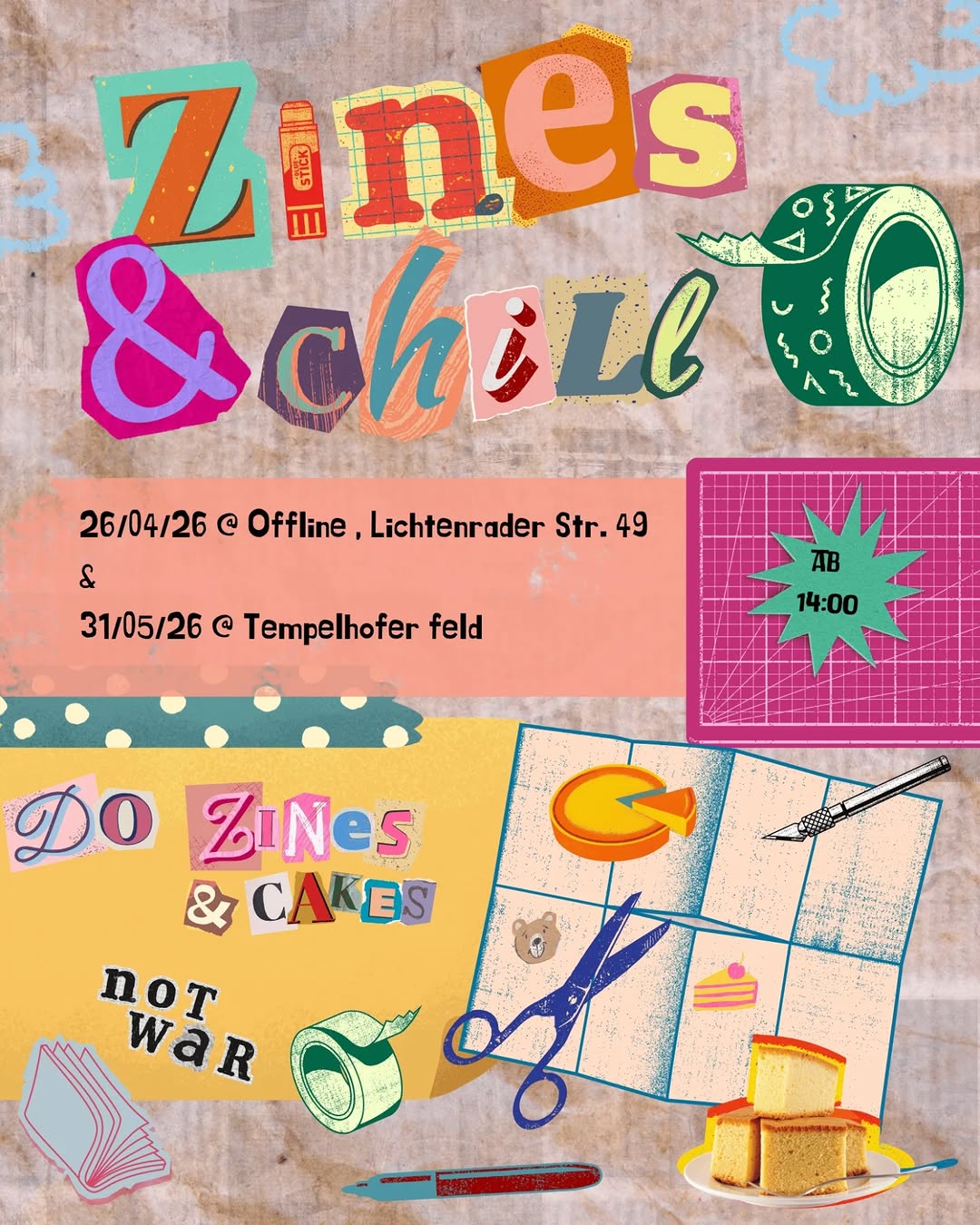 🗓️ Join us on *Sunday April 26th at 14:00 in Offline*, Lichtenrader Str. 49 and *Sunday May 31st at 14:00 at Tempelhofer Feld* to make zines together, have cake, talk, and just chill. Mark your calendars!!!