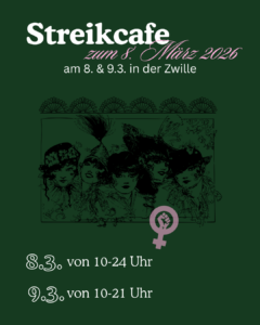 - 08.03. & 09.03.2026, Feminist Strike Café, ZwilleMarch 8 is Feminist Fight Day. We look back on centuries of feminist struggles against the destructive violence of the patriarchal system—together we take to the streets! In anger, solidarity, and tenderness, we want to come together against isolation and create a place for retreat, togetherness, and networking. On Sunday (March 8) and Monday (March… Read more: 08.03. & 09.03.2026, Feminist Strike Café, Zwille