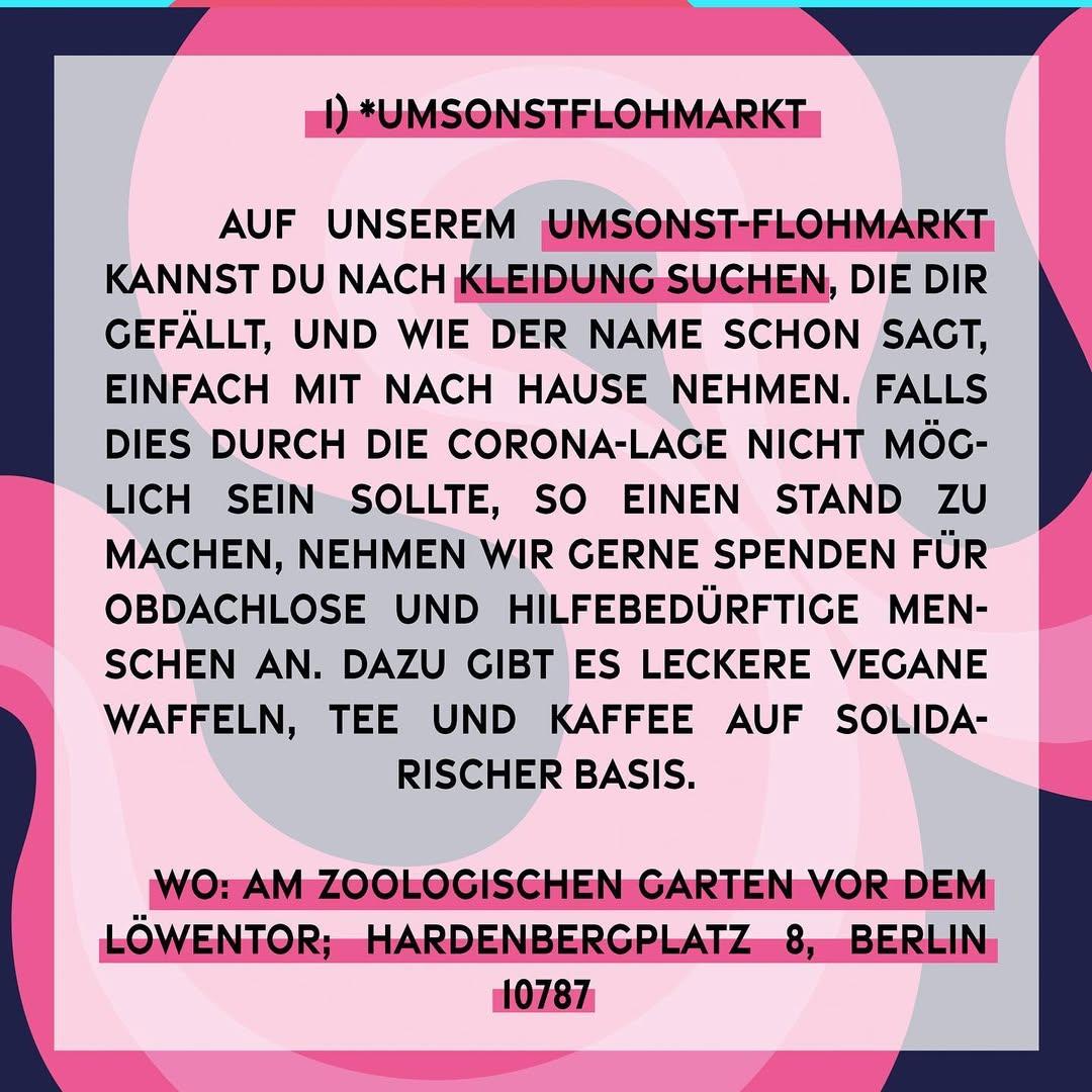 Allerliebste Leute, es ist mal wieder soweit und wir veranstalten erneut einen unserer heißgeliebter U-Flohmärkte. Diesmal „with a twist“: neben einer tollen Auswahl an Klamotten und sonstigem Schnick-Schnack gibt es diesmal unter anderem auch leckeren Tee und Kakao vom Caféeta-Kollektiv sowie musikalische Begleitung von unseren Kiezlegenden! Kommt zahlreich vorbei und bringt gerne eure aussortierten Sachen oder vielleicht sogar was zum Snacken für die Gemeinschaft mit. Denkt bitte auch an eure Masken und an die gültigen Abstandsregelungen.Allerliebste solidarische Grüße