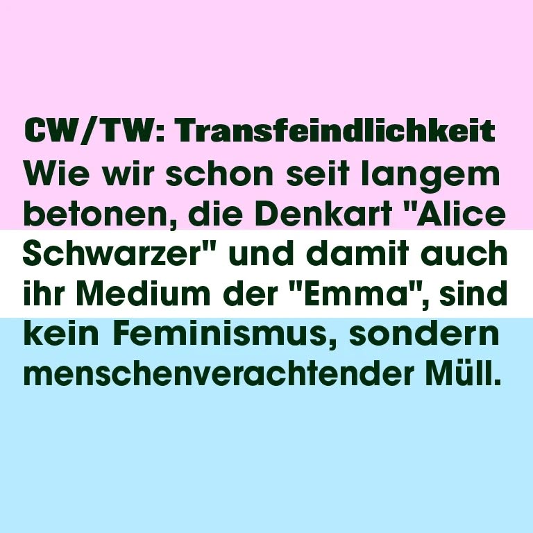 CW/ TW: Transfeindlichkeit: Wie wir schon seit langem betonen, die Denkart „Alice Schwarzer“ und damit auch ihr Medium der „Emma“, sind kein Feminismus, sondern menschenverachtender Müll. Seit Jahren wollen sie Muslima, Sexarbeiter*innen und Transgeschlechtlichen Menschen ihre Selbstimmung absprechen. Das ist das Gegenteil von Emanzipation und Befreiung. Seit längerer Zeit führt die Zeitung „Emma“ eine Hasskampagne gegen eine Bundestagsabgeordnete Tessa Ganserer mit der Begründung, dass sie ihr das Frau sein absprechen. Das ist einfach das allerletzte. Niemand ausser ihr selbst kann sagen welchem Geschlecht sie zugehörig ist. WIR SOLIDARISIEREN UNS MIT TESSA! WIR SOLIDARISIEREN UNS MIT ALLEN ANDEREN BETROFFENEN DIE DIESE HETZE AUSHALTEN MÜSSEN. Boykottiert die Emma. #boykottiertdieemma