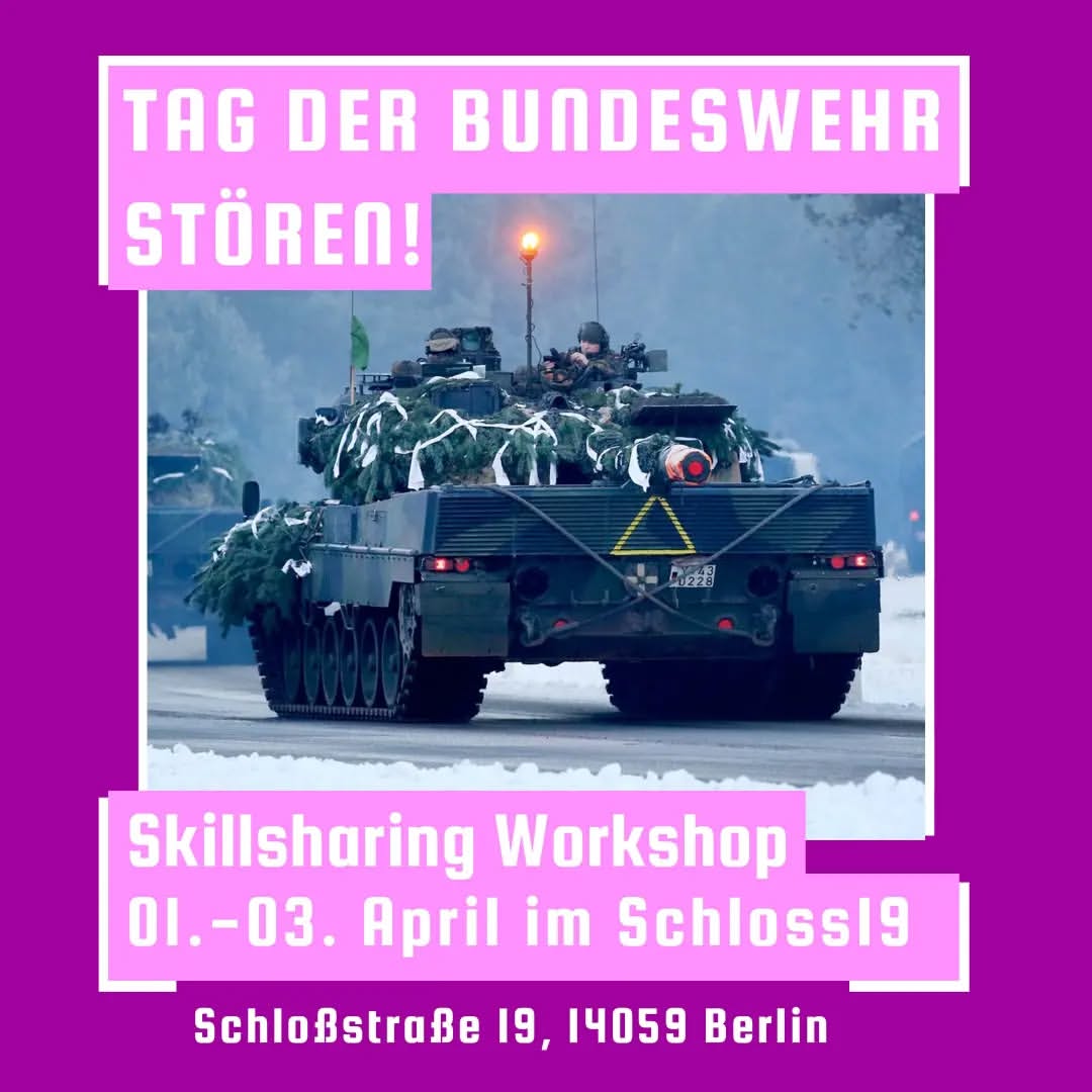 Im Juni 2022 will die Bundeswehr in Berlin den „Tag der Bundeswehr“ feiern. Darauf möchten wir uns vom 1. bis 3. April bei einem bunten Skillsharing-Wochenende zu kreativem Protest vorbereiten. Vermiesen wir den Militärs die Stimmung!