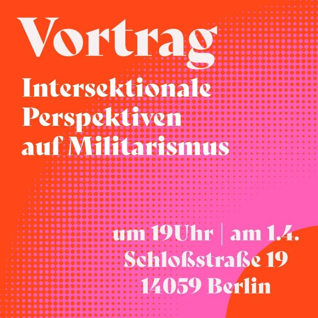 Intersektionale Perspektiven auf Militarismus – 19Uhr, 1.4., Schloßtraße 19, 15079 Berlin – Die Sprache des Krieges ist Gewalt. Der Vortrag versucht die Vielschichtigkeit der Gewalt aufzuschlüsseln, die Geschichte des Militarismus in einem patriarchal-kapitalistischen Kontext einordnen und ein Verständnis dafür zu vermitteln, warum jeder emanzipatorische Kampf von Klimagerechtigkeit über Feminismus hin zum Antirassismus ein antimilitaristischer Kampf ist.