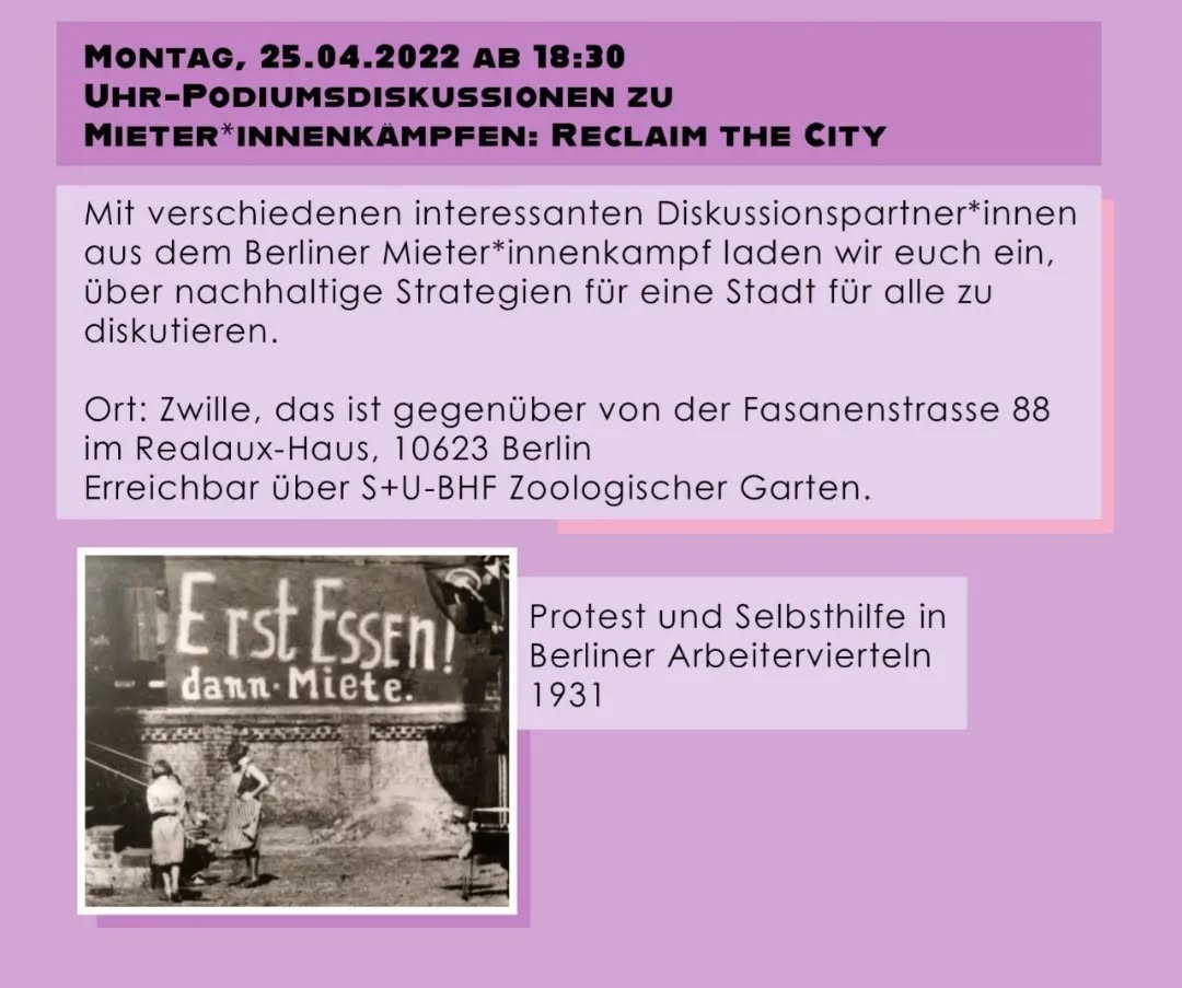 25.04.2022, Podiumsdiskussion zu Mieter*innenkämpfen: Reclaim the City