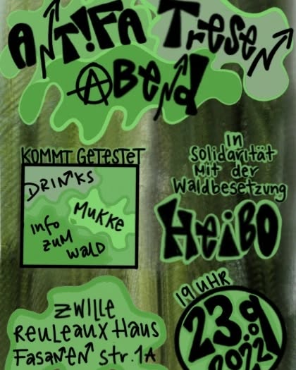 Es ist wieder mal soweit: in der Zwille gibt es am 23.9 neben Mukke und Jetränken auch Infos zur Waldbesetzung im Heibo. Kommt zum Reulaux-Haus in der Fasanenstrasse 1a und bringt alle mit!