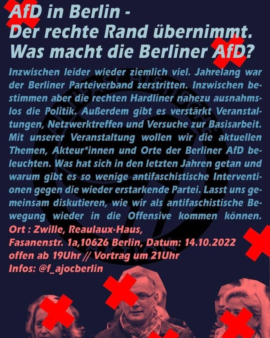 AfD in Berlin – Der rechte Rand übernimmt. Was macht die Berliner AfD? Inzwischen leider wieder ziemlich viel. Jahrelang war der Berliner Parteiverband zerstritten. Inzwischen bestimmen aber die rechten Hardliner nahezu ausnahmslos die Politik. Außerdem gibt es verstärkt Veranstaltungen, Netzwerktreffen und Versuche zur Basisarbeit. Mit unserer Veranstaltung wollen wir die aktuellen Themen, Akteur*innen und Orte der Berliner AfD beleuchten. Was hat sich in den letzten Jahren getan und warum gibt es so wenige antifaschistische Interventionen gegen die wieder erstarkende Partei. Lasst uns gemeinsam diskutieren, wie wir als antifaschistische Bewegung wieder in die Offensive kommen können.